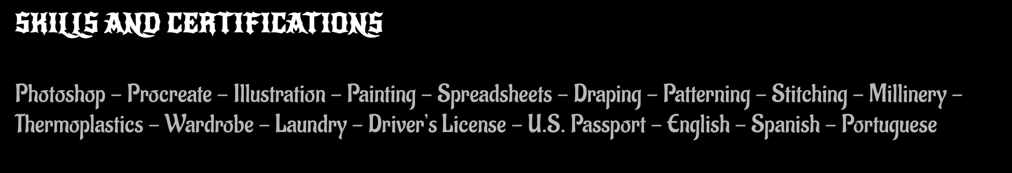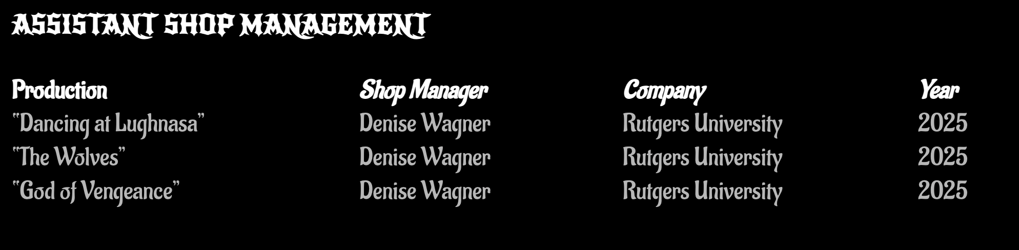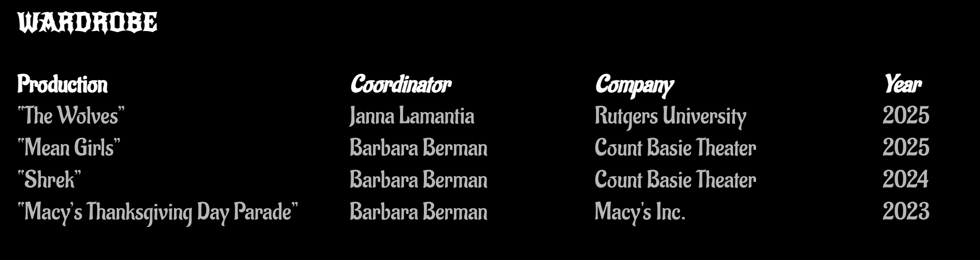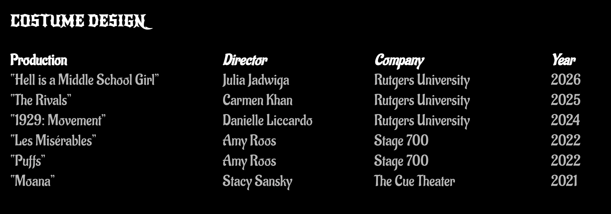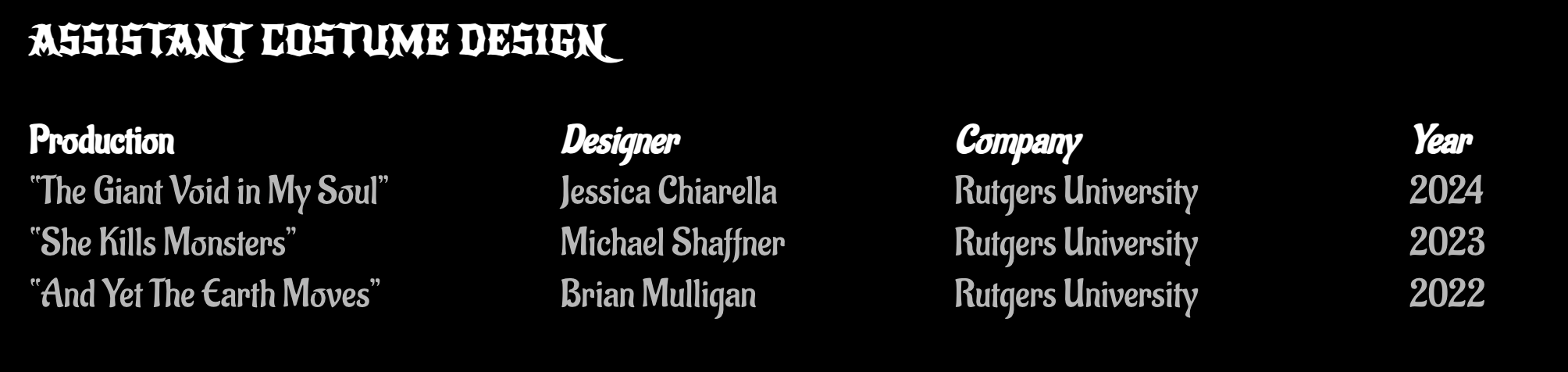 Outside of design, Robyn is an experienced seamstress and craftsman with a range from evening gowns to millinery to jewellery making. In addition, she also has a lot of experience in dyeing garments, distressing for stage and TV, and working with thermoplastics.